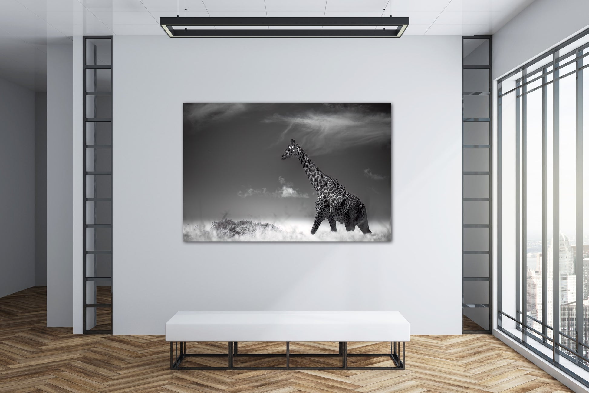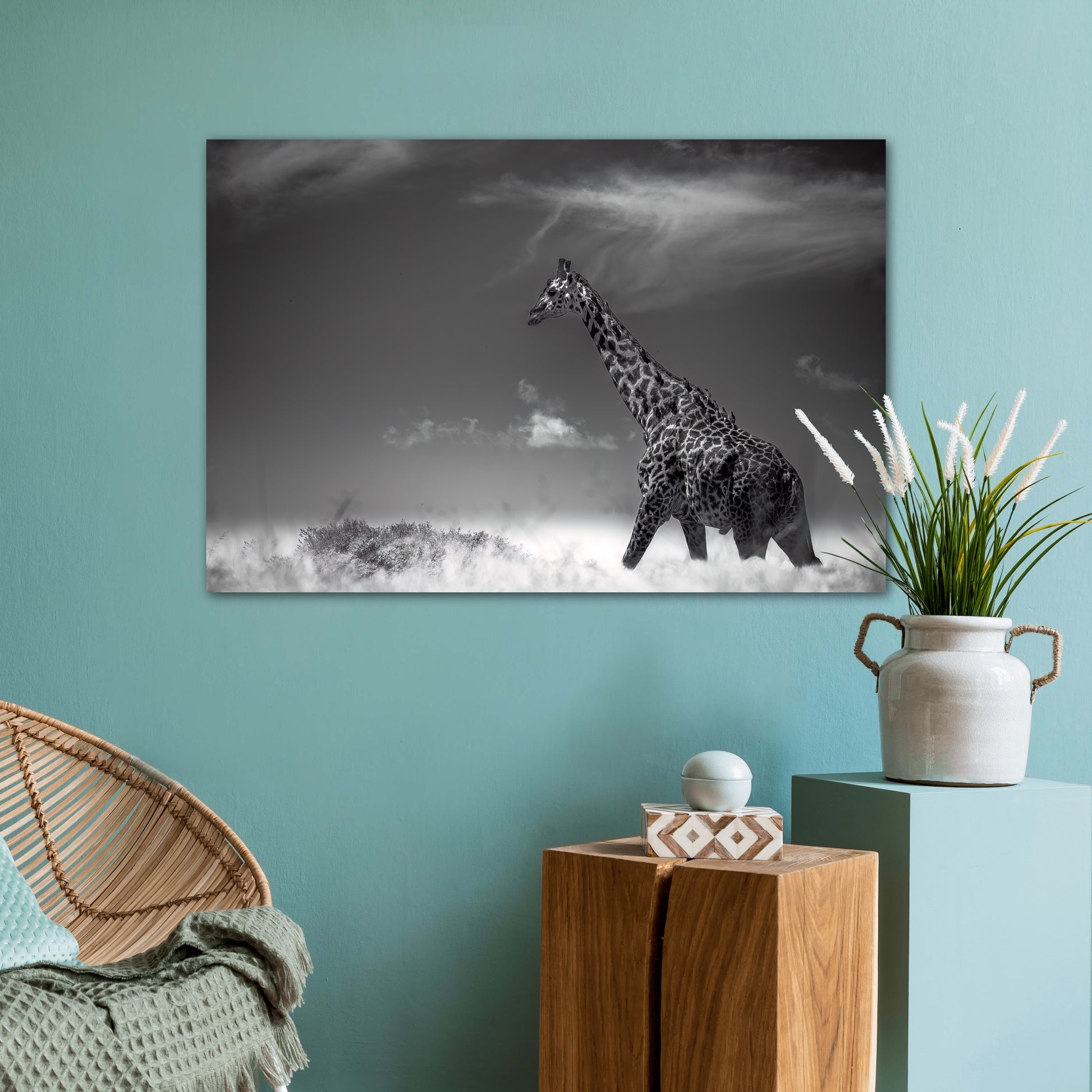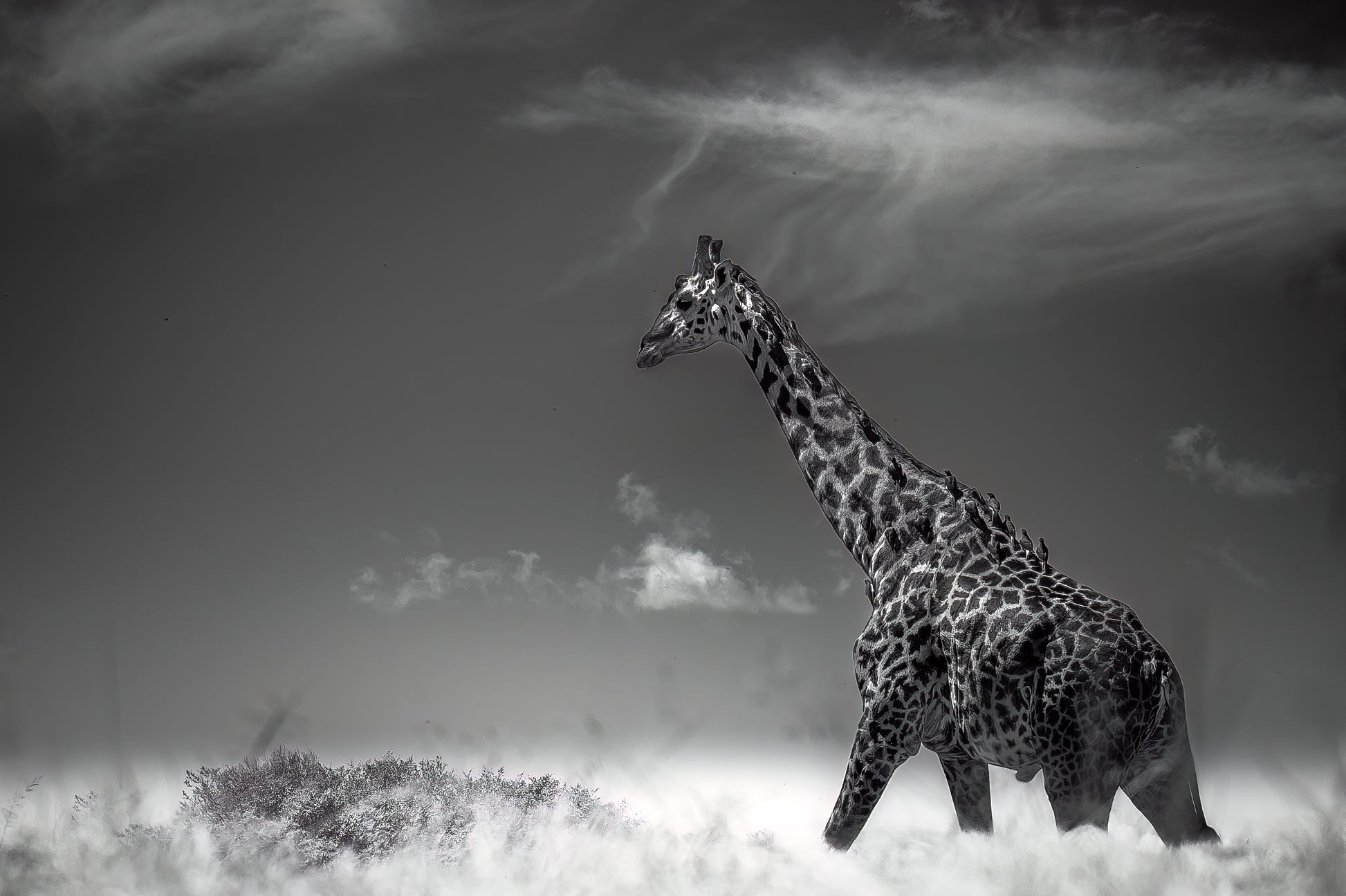 In this captivating photograph taken in Africa, the viewer is transported to the enchanting realm of the savannah. The focal point of the image is a majestic giraffe, its imposing height accentuated by its slender, elongated neck gracefully extending towards the heavens. The giraffe appears at ease, having just concluded a delightful feast on the succulent leaves of a nearby tree. The sky above is a brilliant canvas, dotted with smattering of clouds that add depth and dimension to the composition. Despite the limited cloud coverage, their presence is artfully incorporated, enhancing the visual allure of the photograph.