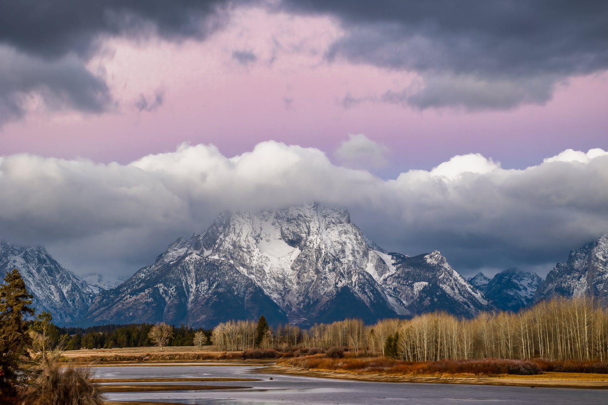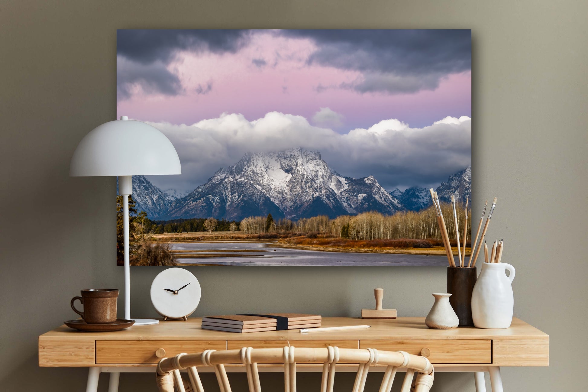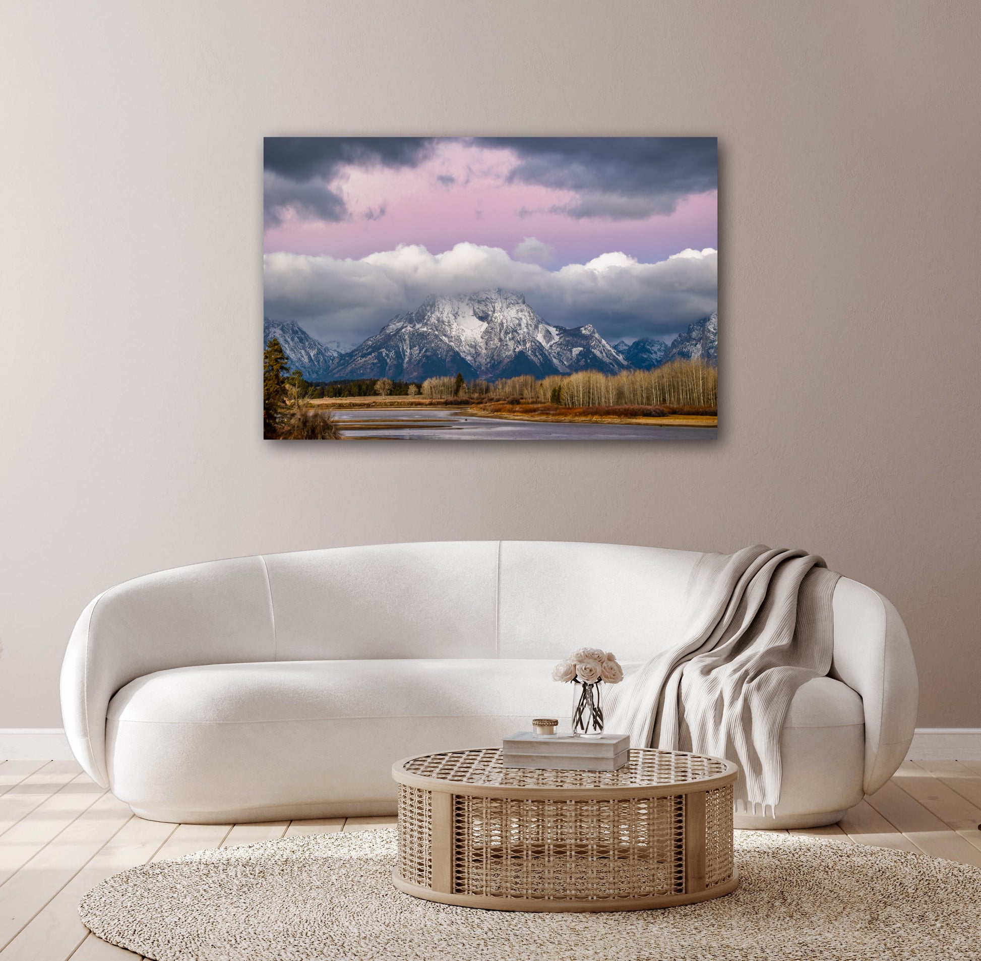 In the captivating photograph titled "Mountains in the Mists," we are transported to the majestic realm of the Grand Tetons in the early morning. The scene unfolds with an ethereal beauty, as the towering peaks emerge from a shroud of mist, their majestic summits disappearing into the embrace of the clouds. The soft hues of blue and purple paint the sky, creating a serene and enchanting backdrop for the grandeur of the mountains. The interplay of colors evokes a sense of tranquility and awe, as if nature itself is casting a magical spell over the landscape. At the base of the photo, a river meanders gracefully, winding its way through the breathtaking scenery. Its tranquil waters mirrors the beauty above, adding a touch of serenity to the composition. The river, perhaps the lifeblood of this pristine wilderness, serves as a reminder of the delicate balance between the power of nature and the peaceful flow of time.
